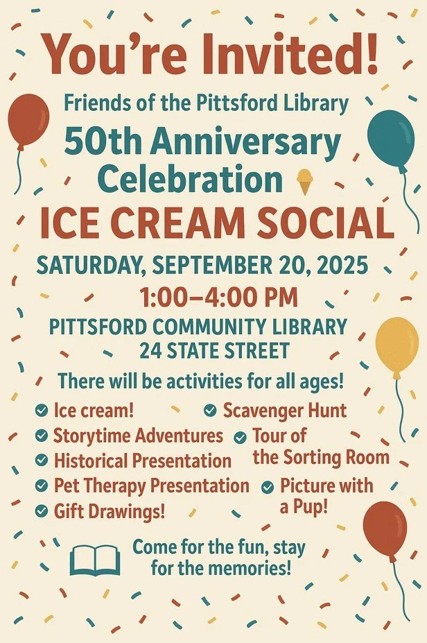 Join us to celebrate the 50th Anniversary of the Friends of the Pittsford Community Library’s Incorporation. At the Library on Saturday, September 20. At 1:30 there will be a Therapy Presentation with Maverick and Teddy, 2:00 Storytime, and 2:30 Picture with a Pup along with conversations and fun. Don’t miss it. We are looking forward to seeing you.